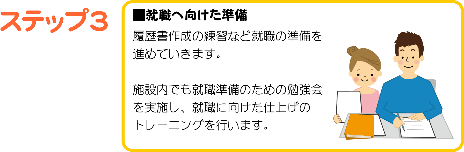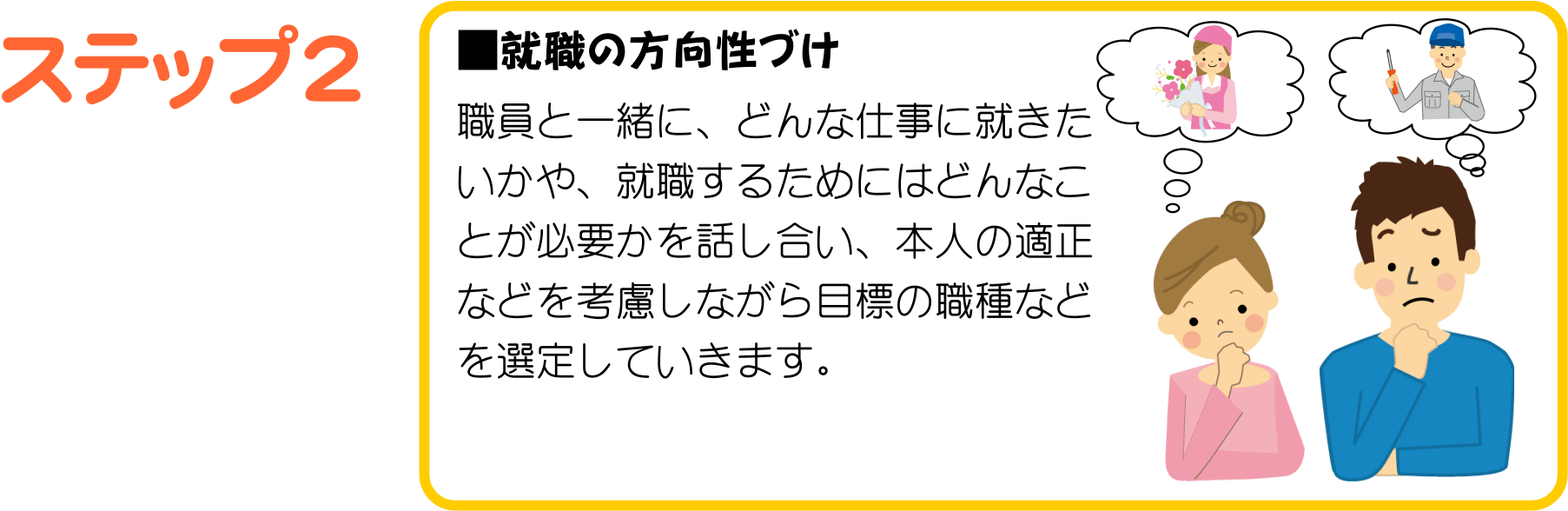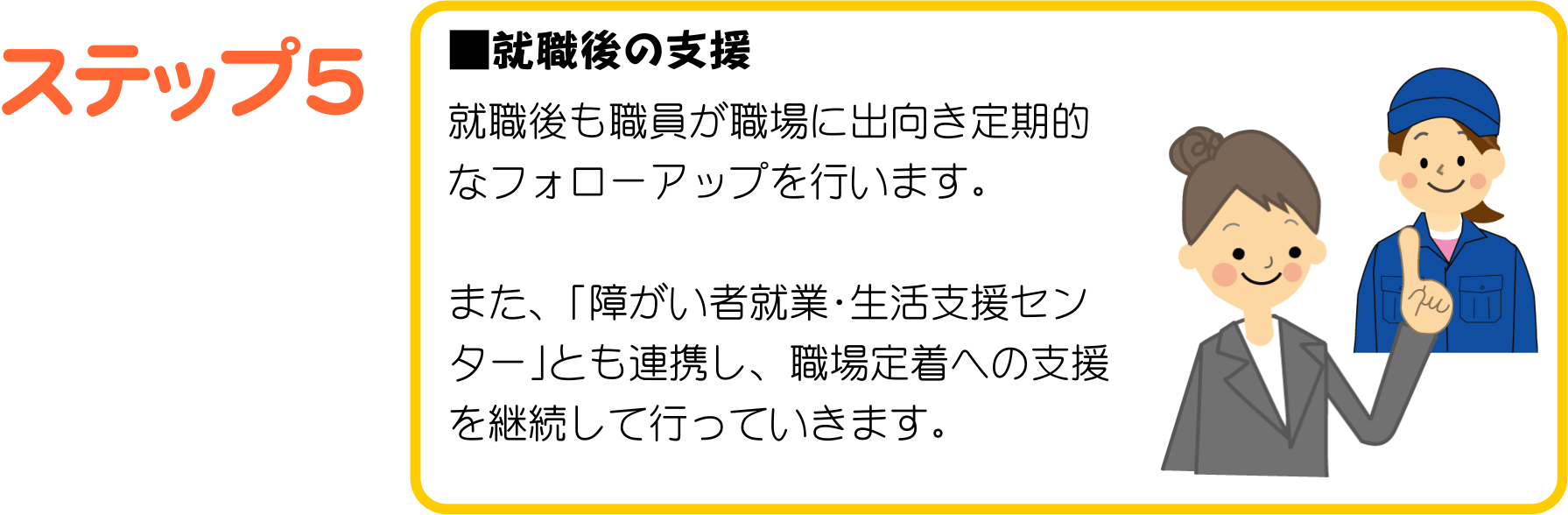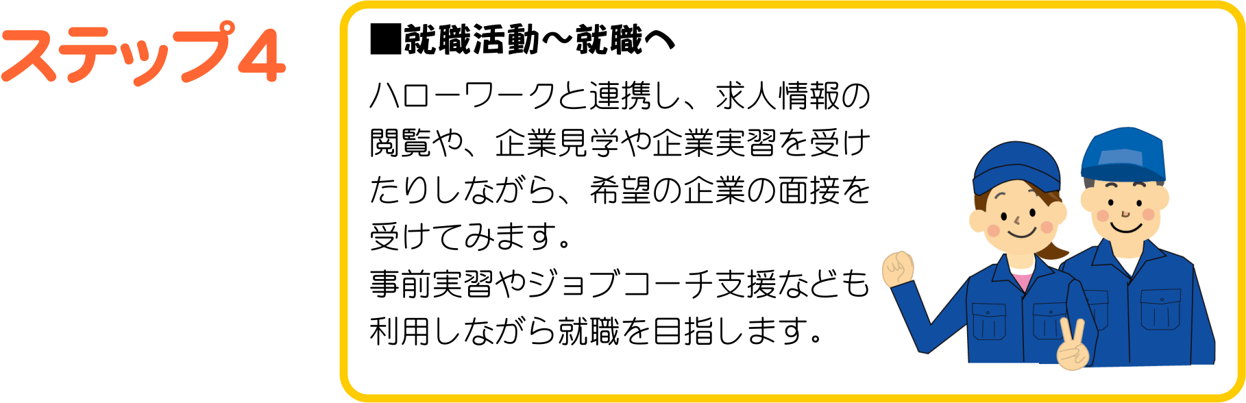 ハローワークや障がい者職業センターとの連携で、おおむね2年間の期間でプログラムを組み、就職に向けた様々な支援を行っております。